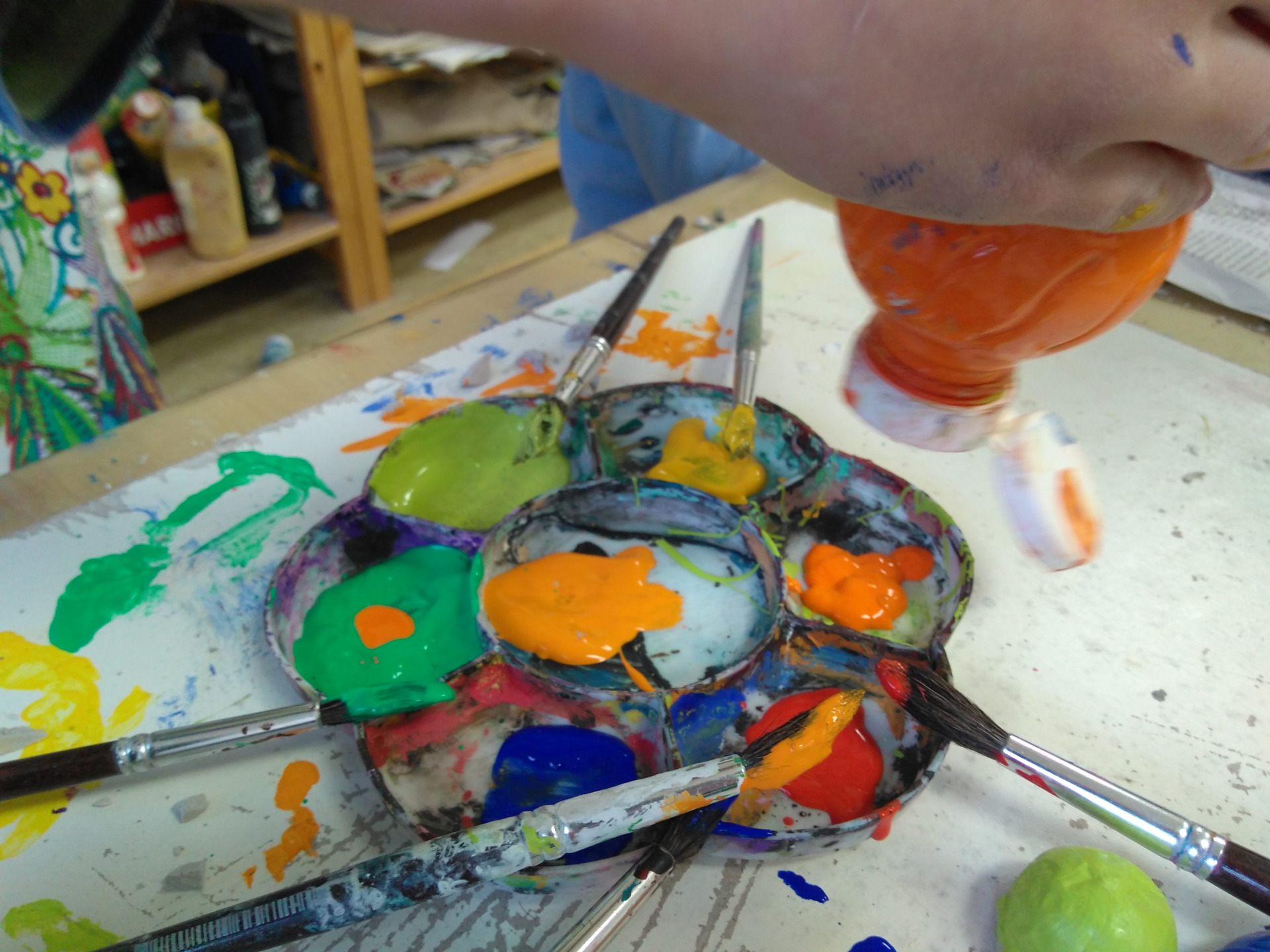Jedes Material hat besondere Eigenschaften, die ein Kind in seiner Entwicklung unterstützen können. So kann z.B. das zarte "Fließende", "Sich-mischende" der Aquarellfarbe oder die klar und kraftvoll aufzutragende Ölkreide ganz unterschiedliche Seiten im Kind ansprechen und vielleicht auch deren Kombination wichtige Erkenntnisse auf der künstlerischen Ebene bringen und auch übertragend für das Leben wichtig sein. Das Materialangebot umfasst sämtliche künstlerische Bereiche mit Aquarellfarbe, Gouache/ Acryl, Bunt- und Aquarellstifte, Pastell- und Ölkreide, Bleistifte in unterschiedlichen Härtegraden, Kohle, Tinte, Ton, Gips, Speckstein und vieles mehr. Auch sämtliches Material aus dem Alltag, wie z.B. Stoff, Wolle, Kisten, Rollen, Dosen, Deckel, Korken, Kerzen, Perlen und so weiter findet in den verschiedenen kreativen Prozessen Verwendung. Durch die wöchentlichen Angebote und das individuelle Experimentieren lernen die Schüler verschiedene Umgangsweisen mit dem Material kennen, sodass für jedes Kind Passendes und Neues für die persönliche kreative Entwicklung im Angebot ist.